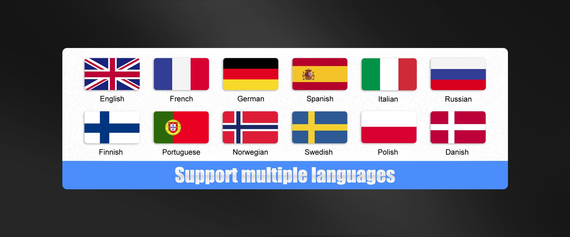 English, French, German, Spanish, Italian, Russian, Finland, Portugal, Norway, Sweden, Poland, Denmark