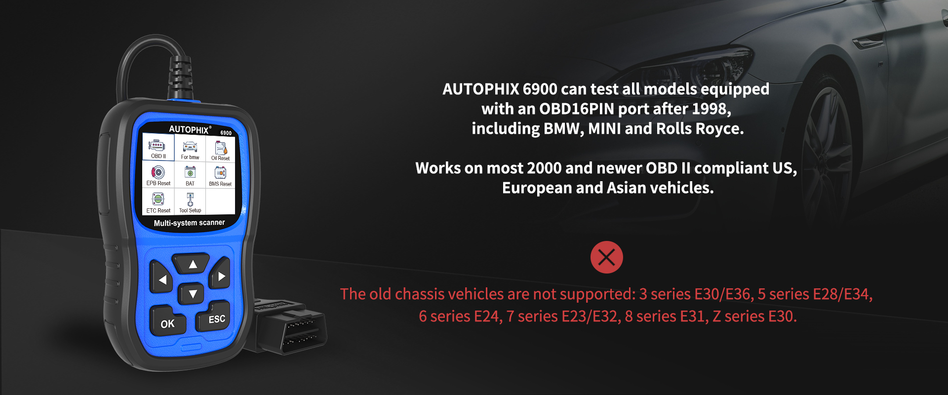 AUTOPHIX 6900 can test all models equipped with an OBD16PIN port after 1998, including BMW, MINI and Rolls Royce.
