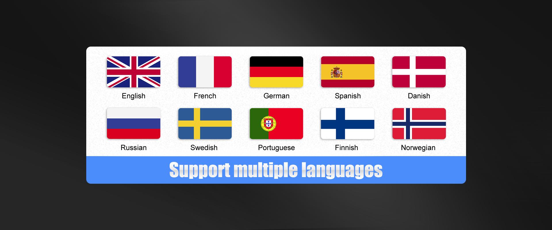 English, French, Spanish, German, Russian, Swedish, Portuguese, Finnish